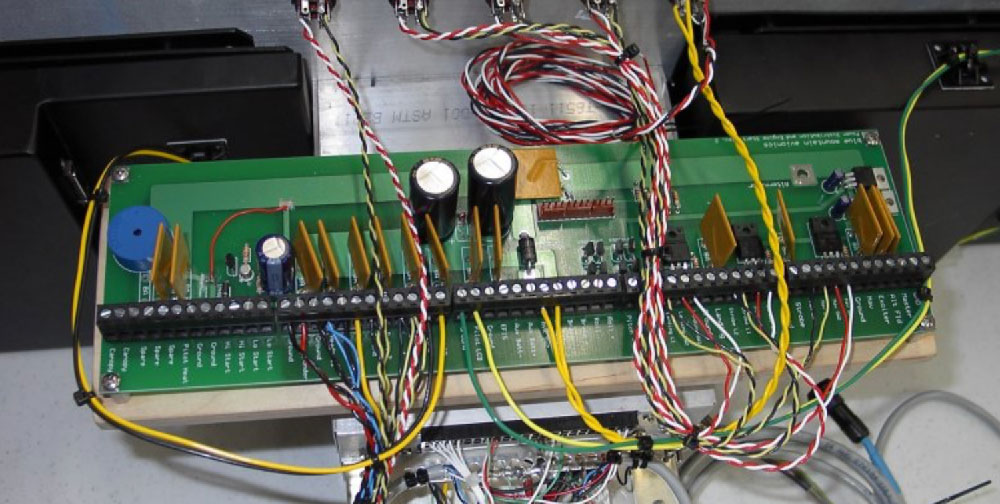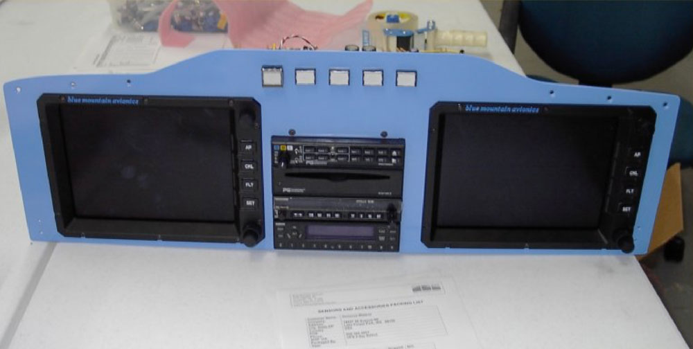 Of course the sole flying example and all known, planned jet canards fly my blue mountain EFIS. Goes without saying, right? Most jets are comlicated machines with long checklists. We all tried very hard to make 722 easy to fly and easy to operate. Note the serious lack of breakers, switches and the usual frankenstein collection of electrical yeehah. The PC board at the back handles switching, lighting, current limiting, fusing, pitch and roll trim, flaps (speed boards in my case), canopy alarm and, well, essentially the whole airplane electrical system.